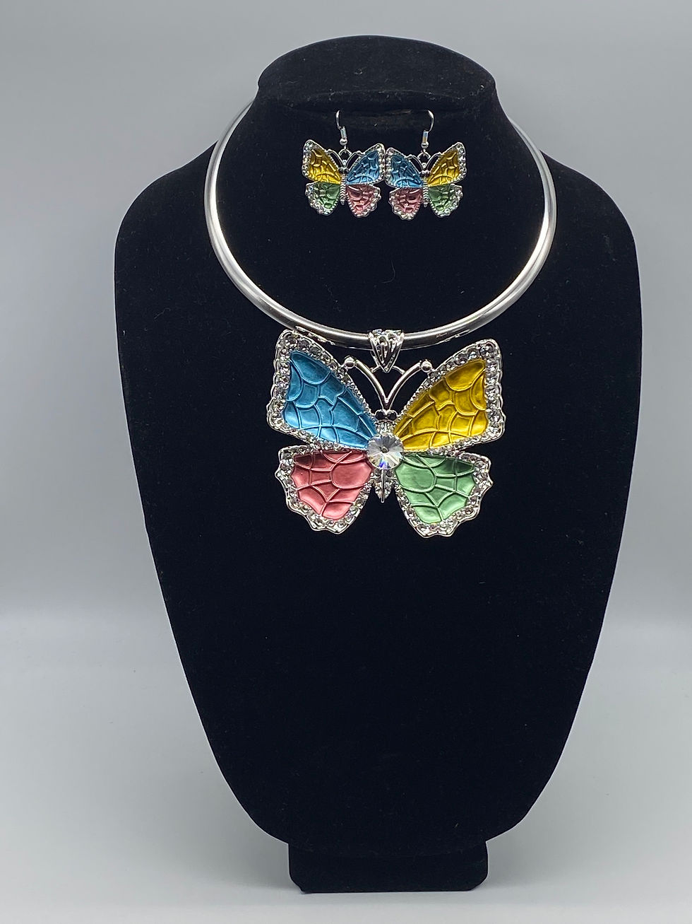 Blue, Yellow, Pink and Green Butterfly Statement Necklace Set